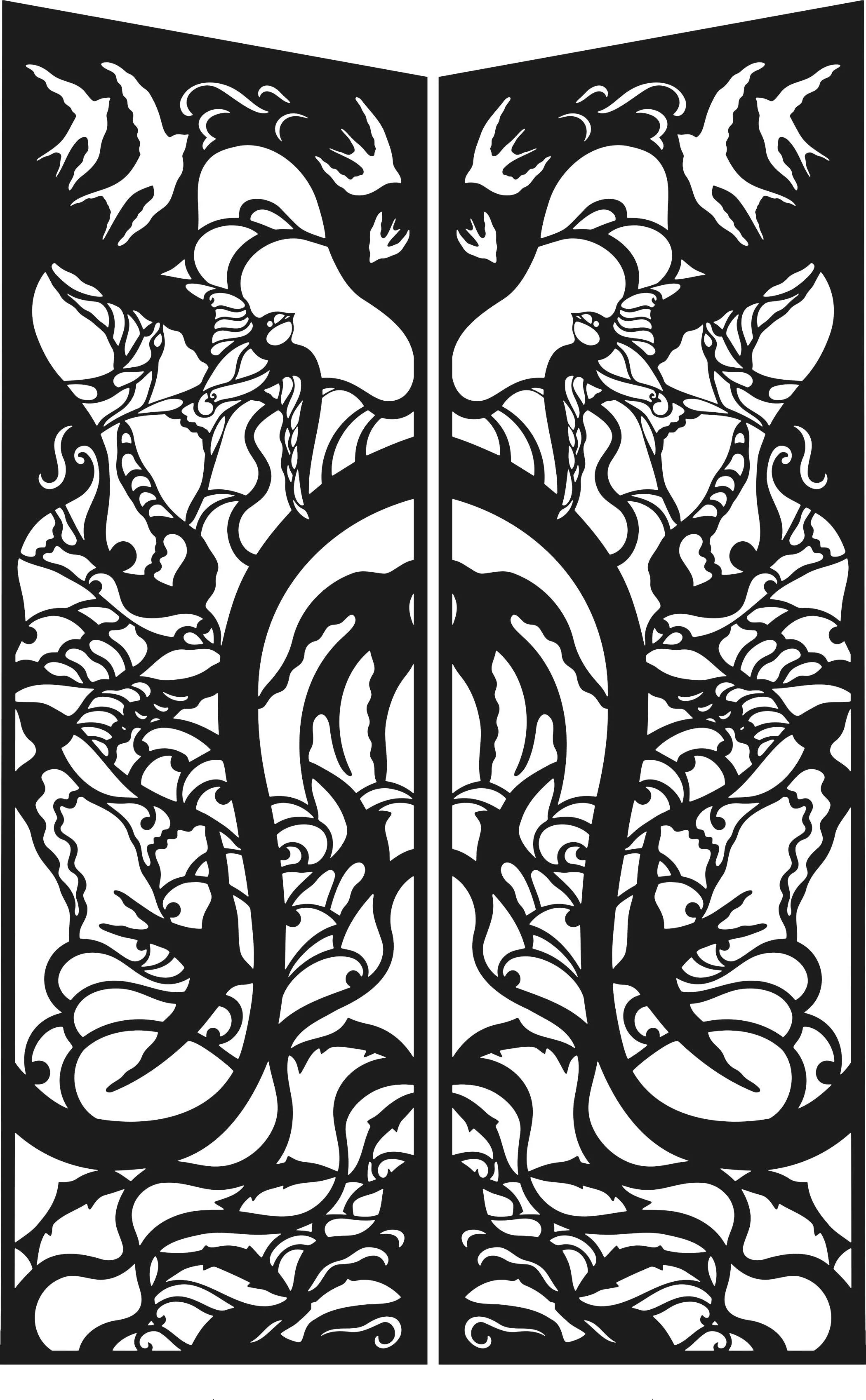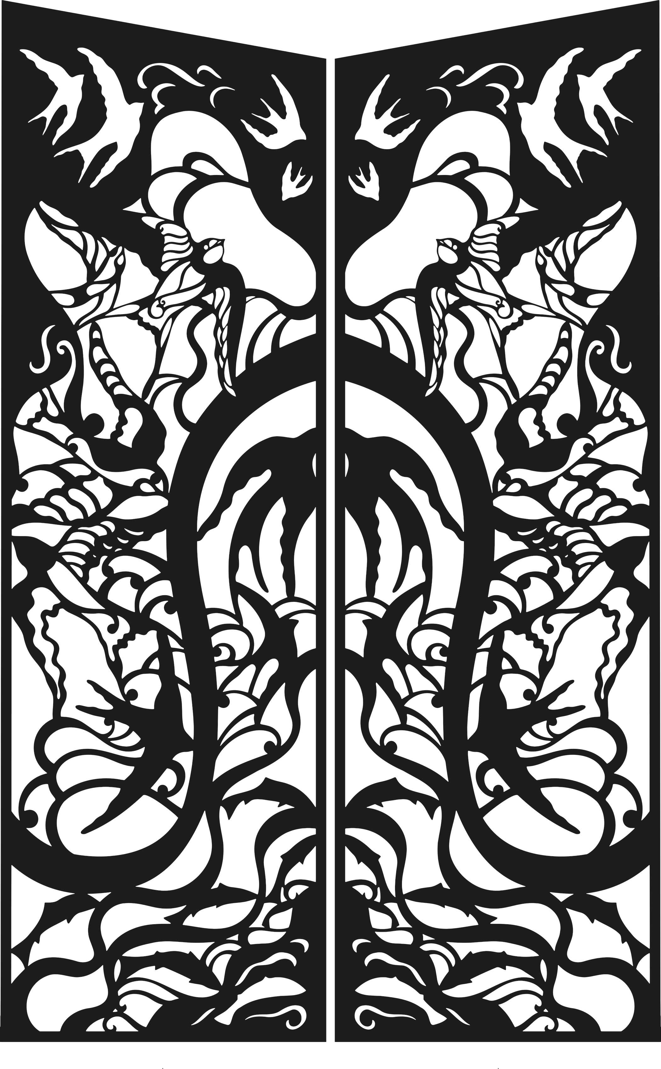 Swallow themed gate which when shut allows swallows to fly in and out of the courtyard.