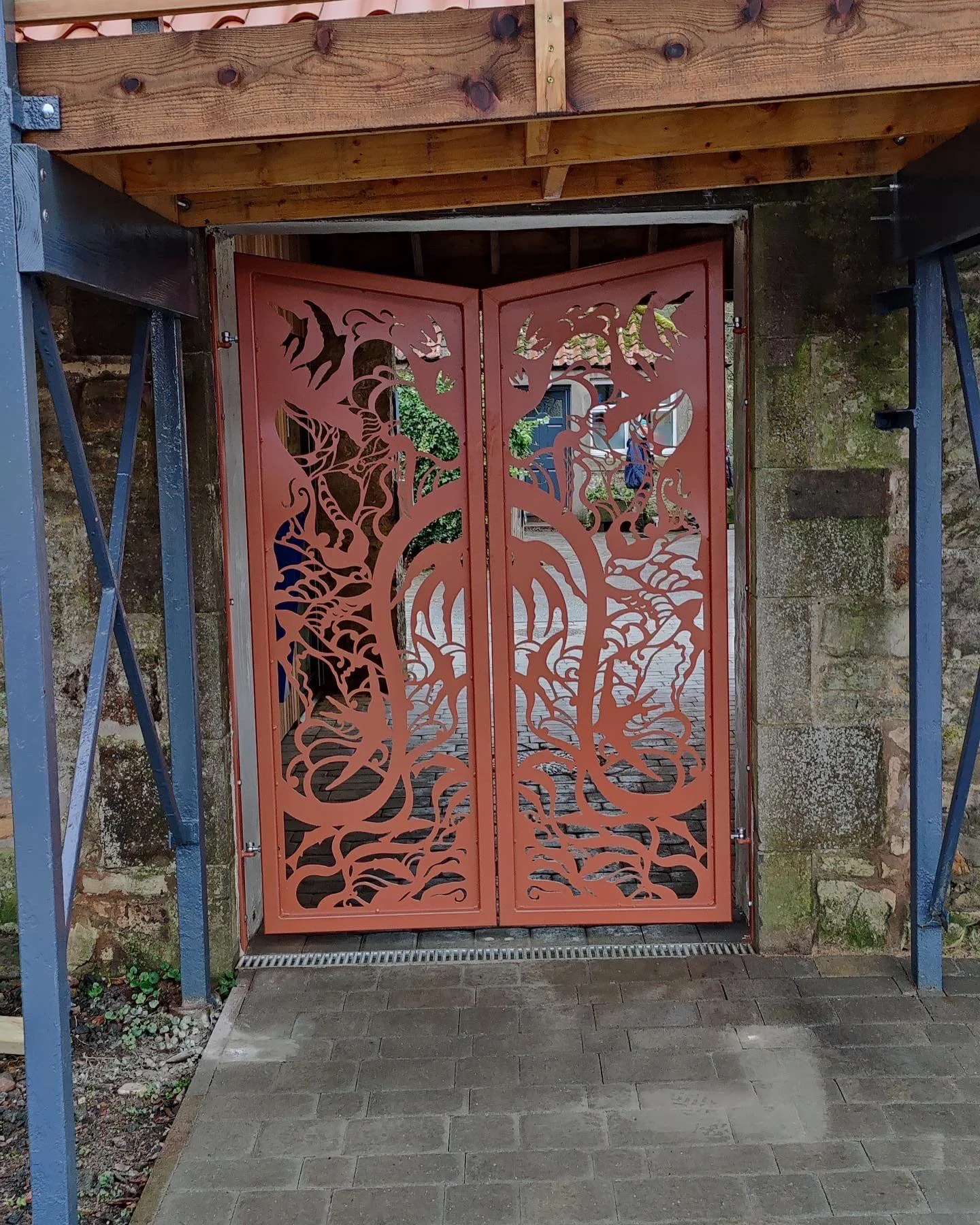 We designed a swallow themed gate which when shut allows swallows to fly in and out of the courtyard. This has a really complex and ornate laser cutting pattern and is designed to tell as story without words.
